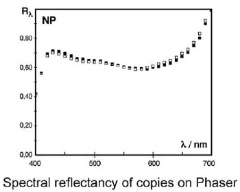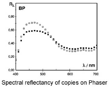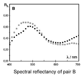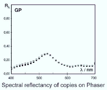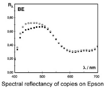 IARIGAI Dubrovnik – Cavtat 2003, Croatia – Advances in printing science and technology: proceedings of the 30 th International iarigai Research Conference; UDK 655:004.91 > (063); 004.91:655 > (063); ISBN 953-96276-6-4 (tvrdi uvez); ISBN 953-96276-7-2 (meki uvez), Acta Graphica Publishers Metamery fading during three color reproduction Dalibor Broz, Darko Agić , Lidija Mandić Faculty of Graphic Arts University of Zagreb Getaldi ć eva 2 HR-10001 Zagreb, Croatia E-mail: mandic@grf.hr Abstract Four pairs of metamery colors were scanned and printed on two different ink jet printers. Considerable decrease or disappearance of metameric characteristics was found on the copies. It was pointed out the possibility of using the pairs of metameric colors in printing production of valuables because their forgeries do not show metamery effect. 1. Introduction In 3-color reproduction spectral characteristics of colors are used in a very rough division in three ranges. Metamery is a very subtle relation between two colors, and it can be supposed that it will be disrupted, changed or it will completely disappear during the reproduction process. Metamery index which can be determined in various ways (Schläpfer K., 1993), (Wyszecki G., Stiles W.S., 1982), as well as according to the prescribed norms (DIN 6172, 1993) does not describe this phenomenon in details. Somewhat longer and more complicated process, which describes metamery in more details and more exactly, giving it three parameters, which will be here only shortly presented, is given in (D.Agic, D.Broz, 2000). ◦ Since the difference between two colors depend on the color temperature of the light source, it is most acceptable to use as the first parameter that color temperature for which the chromaticy difference in color is the smalest (the balancing color temperature Tm) It is not necessary to know Tm exactly, but to mark the interval of color temperature which contains it (interval of balancing temperature Tm). The second parameter is the color difference for the balancing color temperature, calculated in the usual way (∆Em). The third parameter should describe the how "quickly" the cromaticity changes with color temperature in some chosen temperature interval which contains Tm, and which can be indicated by ∆c/∆Tm, with perhaps some more indices that describe it in more detail. The coordinates u’ and v’ for temperatures of 2000 K to 10000 K for a pair of metametric colors are calculated after the measurement on spectral photometer. The coordinate difference ∆u’ and ∆v’ and belonging color temperatures are given in the diagram with ∆u’ and ∆v’ as the coordinate axes (Figure 1). The obtained dependence, which can be conditionally called metamery function and marked by m(Tb), enables the determination of three parameters. ![]() Figure 1: Metamery function 2. Experimental and results Four pairs of metameric colors were tested and marked by R, G, B, N. Spectral reflectancy was determined with Datacolor spectrophotometer, and the results were given in figures 2, 3, 4, 5 in R, G, B and N diagrams. These samples were scanned on Hell 399er scanner under same conditions. The copies were made on two printers (Epson Stylus and Tectronic Phaser 140), which were measured again on spectral photometer. Their spectral reflectancies were given in figures 2, 3, 4, 5 in the diagrams RP, GP, BP and NP (copies on Phaser) and RE, GE, BE and NE (copies on Epson). For all these color pairs (original samples and their copies) according to the above mentioned process, the function m(Tb) for color temperature from 2 kK to 10 kK were determined and given in figures 2, 3, 4 and 5 in the diagrams RM, GM, BM and NM. 3. Conclusions Metamery is an unpredictable phenomena, that could occur in various ways in reproduction. Metamery color characteristics are considerably disturbed during reproduction or they disappear completely. It can be supposed that among the commercial colours one could find such combinations whose metamery disappears during reproduction. This fact can be successfully used for printing valuables because from the original produced with such pairs of metamery colors one could not get "good" colors. By visual observation of such copies illuminated with the incandescent lamp, and then with daylight (or the adequate fluorescent lamp), the color change characteristic for metamery colors clearly visible in originals, could not be seen. Metamery determinations as an alternative method could be included into already existing various series of processes for detecting forgeries, for which it would not be necessary to possess special sophisticated equipment. ![]() Fig. 2: Spectral reflectancies of pair R and copies ![]() Fig. 3: Spectral reflectancies of pair G and copies Fig 4: Spectral reflectancies of pair B and copies Fig. 5: Spectral reflectancies of pair N and copies