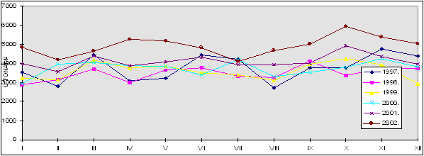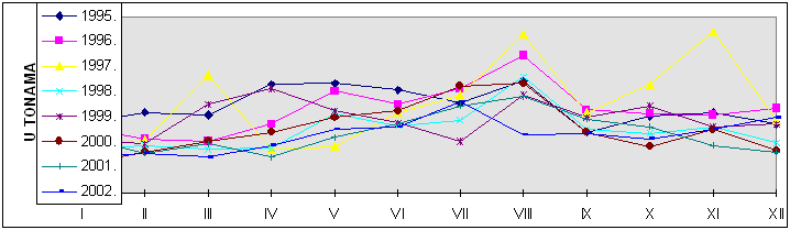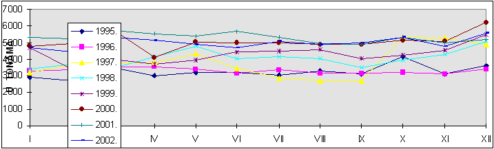 u RH po mjesecima za razdoblje od 1995. do I-XII. 2002. godine dat