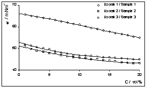 Vrijednost površinske napetosti do-bivene za sva tri uzorka se smanjuje već malim povećanjem koncentra-cije otopine za vlaženje. Sve tri kri-vulje imaju približno sličan tijek, a izmjerene vrijednosti površinske na-petosti značajno su više za uzorak 1 u odnosu na uzorke 2 i 3.