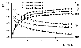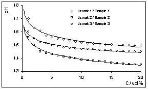 Iz dijagrama na slici 4 vidi se da pH vrijednost za sva tri uzorka naglo pada do koncentracije od oko 3 vol %, a na-kon te koncentracije pad pH vrijed-nosti je značajno sporiji. Najviše pH vrijednosti pokazuje uzorak 1, dok za uzorke 2 i 3 pH vrijednost je nešto niža.