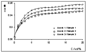 Iz dijagrama na slici 5. vidi se da ko-sinus kontaktnog kuta pri niskim kon-centracijama otopine za vlaženje naglo raste, da bi nakon koncentracije od oko 5 % taj porast bio dosta blaži. Kri-vulje za sva tri uzorka imaju sličan tijek, a vrijednosti kosinusa kontaktnog kuta nešto su veće za uzorak 1.