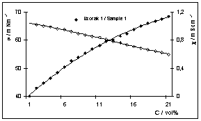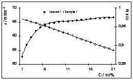 Sl. 6. Zavisnost površinske napetosti ( O ) i električne vodljivosti ( u ) o koncentraciji otopine za vlaženje za uzorak 1