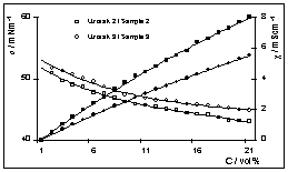 Soli koje povećavaju količinu adsor-birane vode na slobodnim površi-nama tiskovne forme, kao i tvari koje zamjenjuju 2-propanol mijenjaju električnu provodnosti, tako da po-većanjem koncentracije dolazi do njihove disocijacije i stvaranja vodlji-vih iona. Zavisno o njihovom broju zavisi i električna provodnosti ispiti-vane otopine. Za uzorke 2 i 3 elek-trična provodnosti mnogo brže raste (slika 3.) u odnosu na uzorak 1. U ispitivanom području koncentracija otopine za vlaženje sve tri krivulje imaju približno sličan tijek.
