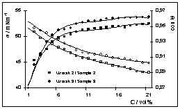 Za mjerenja su korištena tri različita uzoraka komercijalnih koncentrata otopine za vlaženje. Uzorci otopina pripremljeni su razrijeđivanjem kon-centriranih otopina s deioniziranom vodom u različitim omjerima. Konc-entracija otopine za vlaženje iznosi-la je od 0.5 do 20 vol%, a poveća-vana je postupno za 0.5 vol% do koncentracije od 5 vol%, a zatim po 1 vol% do konačne koncentracije od 20 vol%. Tako je dobiveno po 25 uzoraka za svaku otopinu kojima su mjereni fizikalno-kemijski parametri.