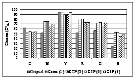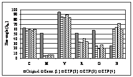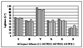 the parallel monitoring of both parameters is most often performed to get the more precise investigation results (Hunt, 1991). The measurements were performed on the full tone patches of the primary colours (cyan, magenta, yellow) and on the full tone patches of the secondary colours (red, green blue) of the subtractive synthesis. From the measuring results of lightness, it is visible that it decreases on each observed sample in regard to the original (Fig. 1). Only on the prints with CtP system (3) there is the considerable increase. The measuring results of colour saturation point at the increase of value in all the systems (except cyan and yellow) (Fig. 2). Because of more precise colour description the hue angle has been defined as the attribute for defining the difference between the two colours. By the determination of the hue angle on the samples, the decrease on all the colours is visible (Fig. 3). Only in cyan the hue is uniform for all the observed systems; magenta is evidently decreased and there is the increase of the hue angle in blue.