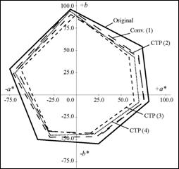 The values a* and b*, determined by measuring the prints, are evidently smaller than the values on the original, for the observed reproduction systems. In this way the range of colour reproduction in all the reproduction systems is decreased, most on the prints realized in CTP system (3).