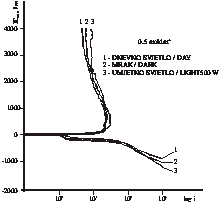 Mjerena je pH vrijednost priprem-ljenih otopina u zavisnosti o njiho-voj koncentraciji. Katodna i anod-na polarizacija provedena je poten-ciodinamičkom metodom pri dnev-nom svjetlu neodređenog intenziteta, umjetnoj rasvjeti (Nitrophot žarulja 500 W) uz uporabu toplinskog fil-tera, te u tami. Sva mjerenja izvedena su pri sobnoj temperaturi.