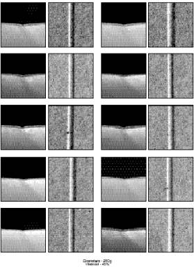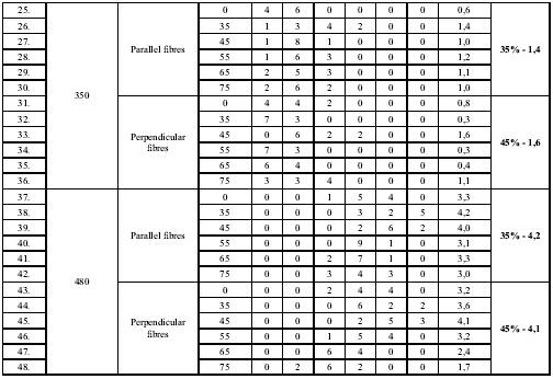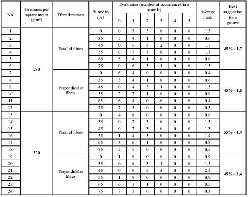 The tests showed that optimum results for grooves perpendicular to the fibre direction were obtained with the humidity of 45%, regardless of the sample weight (g/m 2 ), while those parallel to the fibredirection needed more humidity for smaller weight (the best results for cardboard weighing 280 g/m 2 were obtained with the humidity of 45%, while 320-g/m 2 cardboard requires the humidity of 55% for the optimum groove quality). On the other hand, heavier cardboard needs less humidity (cardboard of 350 g/m 2 and 450 g/m 2 need no more than 35%-humidity for the optimum groove quality). Diagram 1. shows diminishing humidity levels with heavier cardboard.