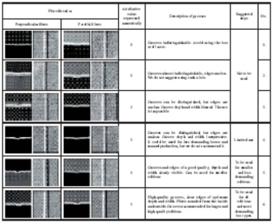 The research demonstrated that cardboard humidity levels in. uence the appearance and the quality of grooves. It is necessary to de. ne the optimum humidity level for each cardboard type in order to achieve good results in practice. The authors wish to underline the fact that the appearance of grooves largely depends on the fibredirection, which, in turn, depends on cardboard humidity. It is a frequent case in installations, especially with large manufacturers of cardboard boxes, that cardboard types are present at the same time, simply because the orders are not usually carried out separately. Therefore, the authors can recommend the constant humidity level of 45%, which suits almost all cardboard types. We also feel obliged to stress that no modern installation for finishing processes in cardboard production should be without a central humidifying system. It is also necessary to have a humidity maintenance system in order to prevent environmental humidity from in. uencing cardboard humidity every time an installation door opens.