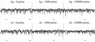 The investigation was made on printing plates with AgX coating before print run (in the results market with “0”), after 1000 prints (marked with “1000”) and after 350000 prints (marked with “350000”). The surface roughness was measured on the silver coating (marked with “Ag”) and on the aluminium-oxide surface (marked with “Al”). All the measurements were performed in the same measurements conditions using Gaus filter of limited wave length λB=0,8 mm with the evaluation length ln=0,4 mm and standard stylus RHT 6-50. For more accurate results each printing plate sample has been measured on five places in parallel printing direction. In the figures 3 and 4 the middle values of the performed measurements are shown.