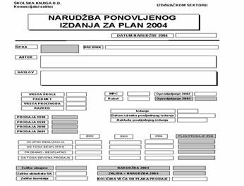 <?xml version="1.0" encoding="UTF-8" ?> - <dataroot xmlns:od="urn:schemas-microsoft-com:officedata" xmlns:xsi="http://www.w3.org/2001/XMLSchema-instance" xsi:noNamespaceSchemaLocation="010112.xsd"> - <NARUDZBA_PONOVLJENOG_IZDANJA> <PRODAJA_2003>7034</PRODAJA_2003> <DEVIZNA_PROD_2003>-35</DEVIZNA_PROD_2003> … <Opred_2002>7414</Opred_2002> <Opred_2003>7316</Opred_2003> <MPC>48</MPC> <Rabat>15</Rabat> </NARUDZBA_PONOVLJENOG_IZDANJA> </dataroot>