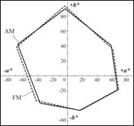 A colour gamut is simply a range of colours. For an output device like a printer, it is the entire range of colours that the device can produce (Hunt, 1991). To visualize a printer gamut, the measurements of six colour (CMYRGB) were taken and the results were drawn in the CIE La*b* color space (Fig. 1).