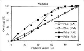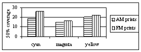 The dot gain has been determined considering the different reproduction of the midtones in both reproduction systems (Fig. 5). The results show that the increase of the coverage is slightly bigger on the prints made by using the FM screening method.