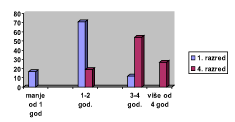 U prvim razredima 71% ispitanika se koristi internetom između 1 - 2 godine, a u četvrtim razredima čak 54% ispitanika u razdoblju 3 - 4 godine i 27% više od 4 godine.