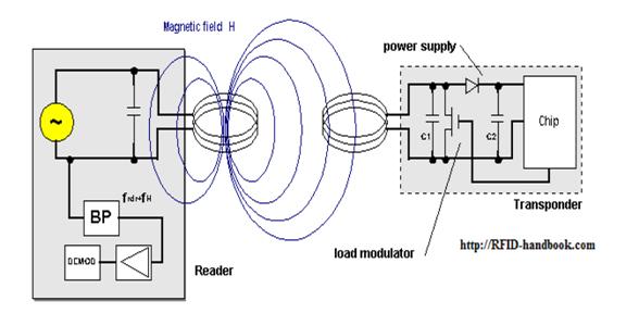 Kod identifikacije s RFID tehnologijom radi se o izmjenjivanju radijskih signala niske snage između čitača i elementa - prijenosni medij su radiovalovi. Čitač u svojoj okolici stvara jako radiofrekventno magnetsko polje. Kada se element na objektu približi čitaču i uđe u njegovo polje, „pobudi“ se elektronska veza u elementu i pošalje svoj podatak (vlastiti identifikacijski kod, podatke) u obliku radiosignala. Čitač primi taj signal i u primjerenom ga obliku pošalje računalu. U slučaju da se radi o elementu „čitaj - piši“, čitač također „zapiše“ nove podatke u unutarnju memoriju elementa.