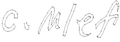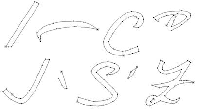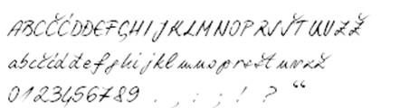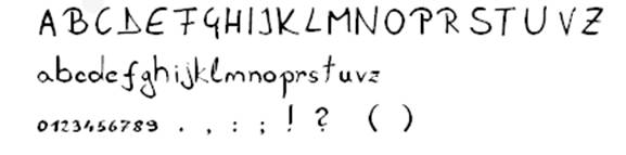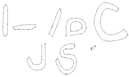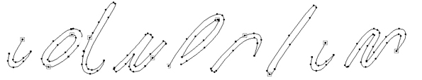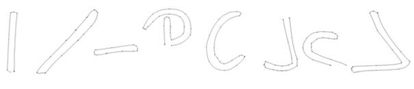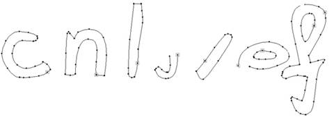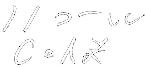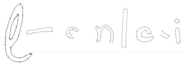 Na slici br.3 prikazani su specifični elementi koji stvaraju kurentna slova rukopisa prikazanog na slici br.1. Zbog specifičnosti rukopisa kurentno slovo „l“ potrebno je izraditi posebno. Ono u sebi sadrže drugačije poteze koji se ne mogu upotrijebiti za ostale znakove. Zbog toga je najpraktičnije rješenje kreirati cijeli slovni znak. Kada bi se posebno stvarali elementi za taj znak oni se nebi mogli upotrijebiti za ništa drugo.