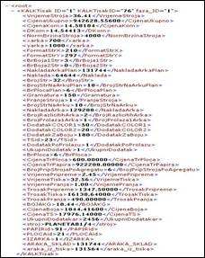 Developed XML model represents calculation of time and printing price. Model has all options in production that are needed for accomplishing a specific finished product. That are XML elements as identification name of calculating experiment, ID of printing machine which is prepared for printing, ID of selected paper, ID of selected offset panel, normative provision ponder for velocity of printing, defined edition of work, number of work pages, format of work page, format of printing sheet, number of colours from front and number of colours from opposite side of page, and number of pages on sheet paper. Experimental results are on the same XML document, and analysed model variables have results presented on clear and unique manner. Resulted XML elements which are calculating and recording into XML document are, for example: edition of sheet paper, planed edition of sheet paper with incorporated technological and finishing addition, number of panels, time of machine preparation, time of machine cleaning, time of printing, total needed time for finalisation of product edition, papers costs, panels costs, colours costs, total price of product edition, and product unit price (figure 4).